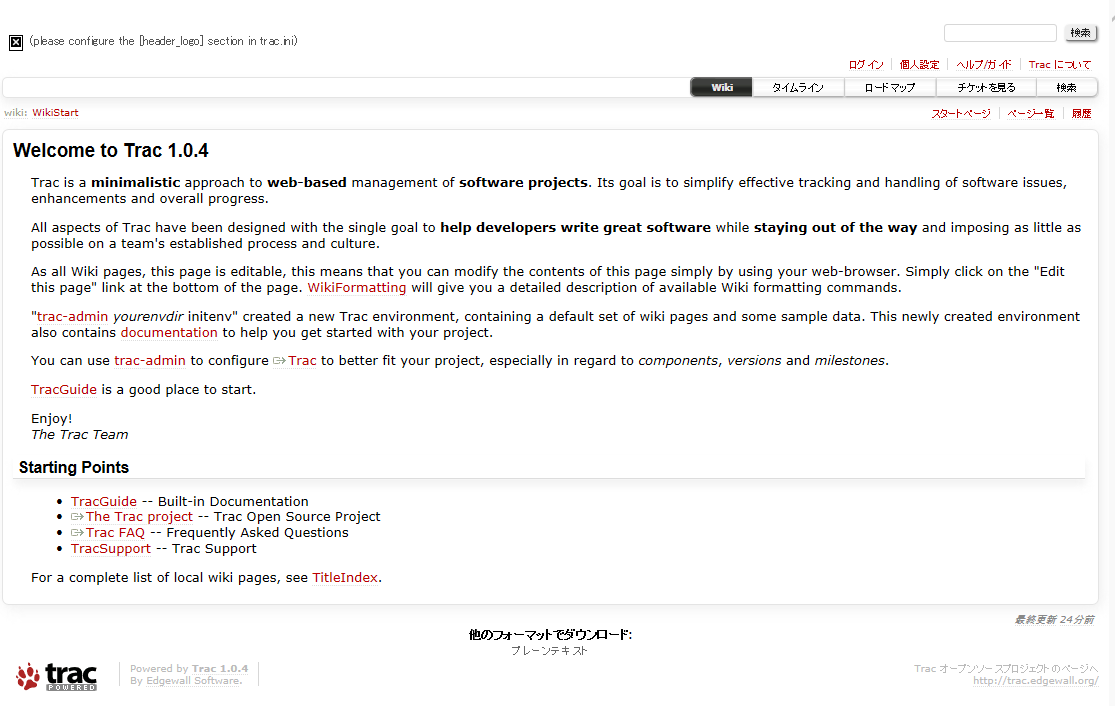 root@g7:~ # mkdir -p /usr/local/www/trac/sandbox root@g7:~ # trac-admin /usr/local/www/trac/sandbox initenv Creating a new Trac environment at /usr/local/www/trac/sandbox Trac will first ask a few questions about your environment in order to initialize and prepare the project database. Please enter the name of your project. This name will be used in page titles and descriptions. Project Name [My Project]> sandbox Please specify the connection string for the database to use. By default, a local SQLite database is created in the environment directory. It is also possible to use an already existing PostgreSQL database (check the Trac documentation for the exact connection string syntax). Database connection string [sqlite:db/trac.db]> Creating and Initializing Project Installing default wiki pages CamelCase imported from /usr/local/lib/python2.7/site-packages/trac/wiki/default-pages/CamelCase InterMapTxt imported from /usr/local/lib/python2.7/site-packages/trac/wiki/default-pages/InterMapTxt InterTrac imported from /usr/local/lib/python2.7/site-packages/trac/wiki/default-pages/InterTrac : : : WikiRestructuredText imported from /usr/local/lib/python2.7/site-packages/trac/wiki/default-pages/WikiRestructuredText WikiRestructuredTextLinks imported from /usr/local/lib/python2.7/site-packages/trac/wiki/default-pages/WikiRestructuredTextLinks WikiStart imported from /usr/local/lib/python2.7/site-packages/trac/wiki/default-pages/WikiStart --------------------------------------------------------------------- Project environment for 'sandbox' created. You may now configure the environment by editing the file: /usr/local/www/trac/sandbox/conf/trac.ini If you'd like to take this new project environment for a test drive, try running the Trac standalone web server `tracd`: tracd --port 8000 /usr/local/www/trac/sandbox Then point your browser to http://localhost:8000/sandbox. There you can also browse the documentation for your installed version of Trac, including information on further setup (such as deploying Trac to a real web server). The latest documentation can also always be found on the project website: http://trac.edgewall.org/ Congratulations! root@g7:~ #
