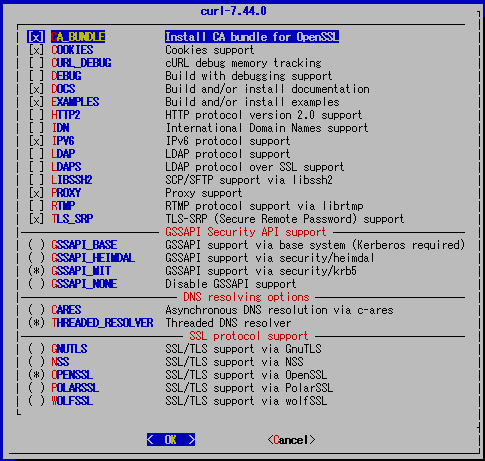 どうやら、/usr/ports/ftp/curl のコンパイルオプションで、デフォルトのGSSAPI_BASE (or NONE?)が選択されている場合は他のものにする必要があるとのこと。