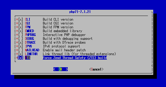 pkg remove '*php73*' portinstall lang/php74 ZTS cd /usr/ports/lang/php74-extensions make config make install clean portinstall mod_php74 ZTS portinstall databases/phpmyadmin Nextcloud 稼働サーバだとこれも↓念為 portinstall devel/pecl-APCu