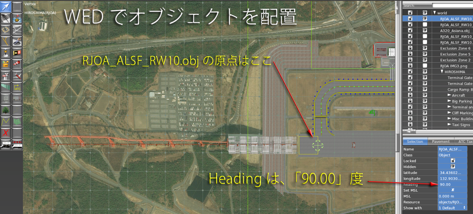 - 解凍し、RJOA_ALSF_RW10.obj, ALSF_Br.dds、を X:\X-Plane_11\Custom Scenery\RJOA v1.1\objects などへコピーしてWEDでRWY10へ。