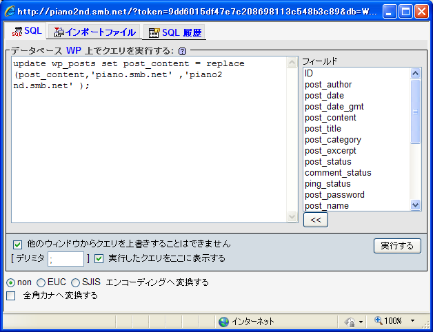 update wp_posts set guid = replace(guid,'piano.smb.net' ,'piano2nd.smb.net' ); update wp_Counterize_Referers set name = replace(name,'piano.smb.net' ,'piano2nd.smb.net' ); update wp_posts set post_content = replace(post_content,'piano.smb.net' ,'piano2nd.smb.net' );